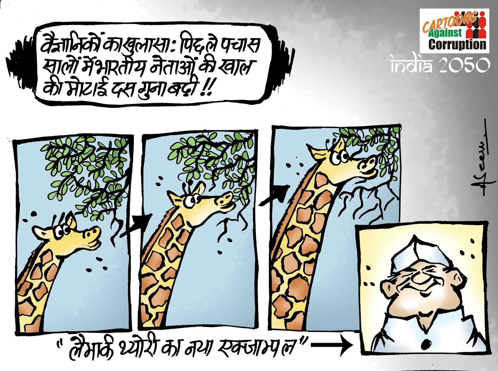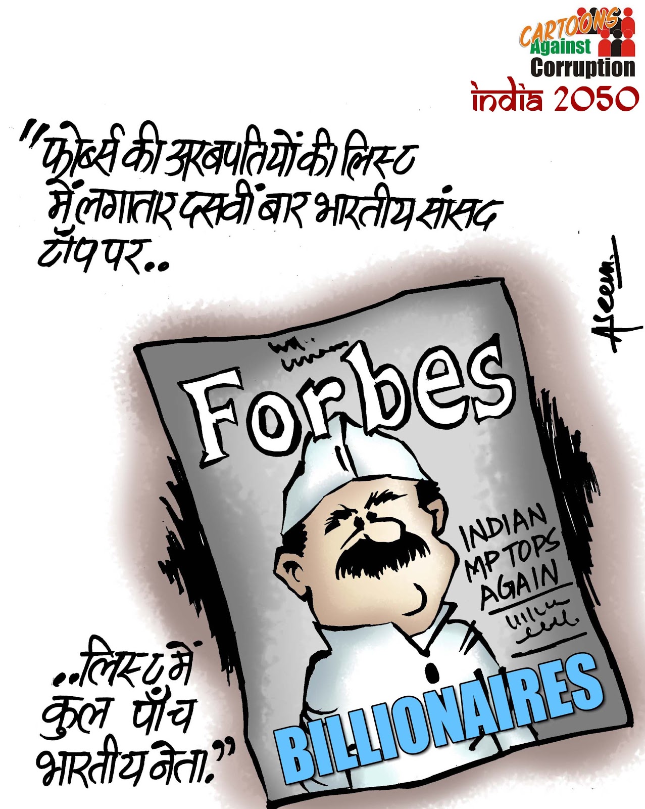 Trivedi’s work on the site is divided into seven categories: India 2050, The Dirty Picture Of India, New National Symbols, Attack On Free Speech, Gandhi Returns, Pigvijay Special, and JOKEpal. The cartoon on an Indian MP topping the Forbes’ list is part of the “India 2050” category.